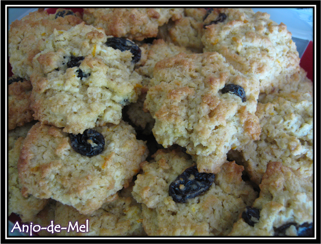 125g de farinha de trigo (sem fermento); 1/2 c. (de chá) de bicarbonato de sódio; 150g de açúcar amarelo; 1 c. (de chá) de fermento; 125g de margarina; 1 ovo; 1 c. (de chá) de essência de baunilha; raspa de 1 laranja; 150g de flocos de aveia (finos); 100g de coco ralado; 50g de passas.