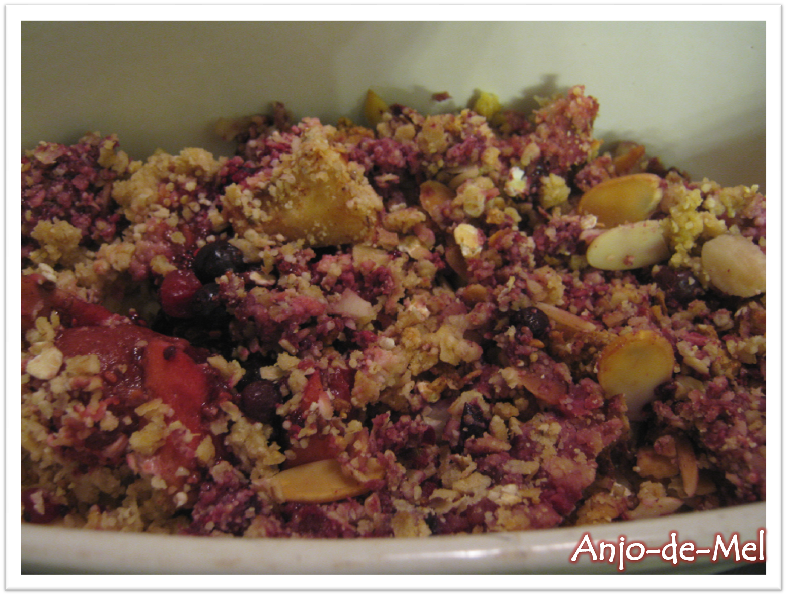 Ingredientes: 3 chávs. de mistura de frutos vermelhos congelados; 2 maçãs (descascadas); 1 c. (de chá) de cardamomo em pó; 1 c. (de chá) de canela em pó; 1/2 c. (de chá) de gengibre em pó; 1/2 c. (de chá) de essência de baunilha; sumo de 1 laranja; 2 c. (de sopa) de maple syrup; 2 c. (de sopa) de sementes de chia; 2 chávs. de flocos de aveia; 1/2 cháv. de farinha de quinoa; 1/2 cháv de farinha sarraceno; 1/2 c. (de chá) de cardamomo em pó; 1/2 c. (de chá) de essência de baunilha; 2 c. (de sopa) de maple syrup; 2 c. (de sopa) de óleo de coco (frio cortado em pedaços); 2 c. (de sopa) de amêndoa laminada. Preparação: Aquecer o forno a 170ºC. Num tabuleiro de ir ao forno colocar os frutos vermelhos e as maçãs; polvilhar com as especiarias e com a baunilha. Regar com o sumo de laranja e o maple syrup e misturar tudo. Polvilhar com a chia, misturar e deixar ficar enquanto faz o crumble. Numa tigela misturar a aveia, as farinhas, o cardamomo e a baunilha, misturando bem. Regar com o maple syrup, adicionar o óleo de coco frio cortado em pedaços e misturar tudo com os dedos até obter uma massa que se assemelhe a migalhas. Juntar a amêndoa laminada e misturar novamente. Polvilhar por cima da fruta e levar ao forno por 20 minutos, ou até dourado (se quiser mais mole cozinhe por mais tempo). Servir quente ou morno, com ou sem uma bola de gelado. Nota: receita original encontrada aqui.
