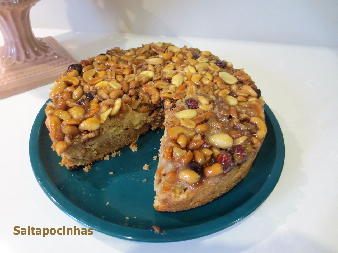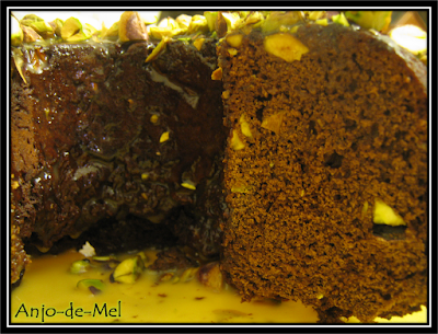 Verter o caramelo sobre o bolo e polvilhar com mais pistáchios picados.