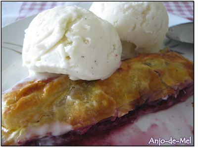 Nota:receita original daqui. Uma vez que eu só tinha uma placa de massa folhada, coloquei o recheio de um lado / numa metade da massa e sobrepus com a outra metade.