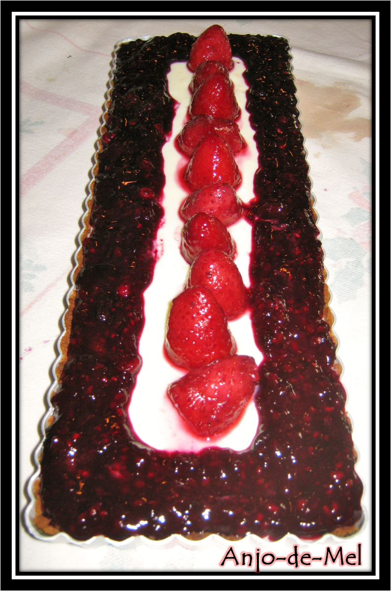 Triturar as bolachas (usei um robot de cozinha) e misturar a margarina derretida. Forrar o fundo e os lados de uma tarteira (usei rectangular) com este preparado. Levar ao forno a 180 ºC por 12-15 min. e deixar arrefecer depois de retirar. Colocar numa taça as folhas de gelatina com um pouco de água fria e reservar. Bater o queijo-creme com a raspa de limão. Juntar a lata de leite condensado e o sumo de limão, incorporando bem. Por fim misturar a gelatina previamente dissolvida num pouco de água fervente. Deitar esta mistura de queijo sobre a tarteira (já depois da base de bolacha ter arrefecido). Levar ao frio, no mínimo, cerca de 5 horas ou deixar ficar durante a noite. Decorar com o doce de frutos vermelhos e os morangos a gosto.