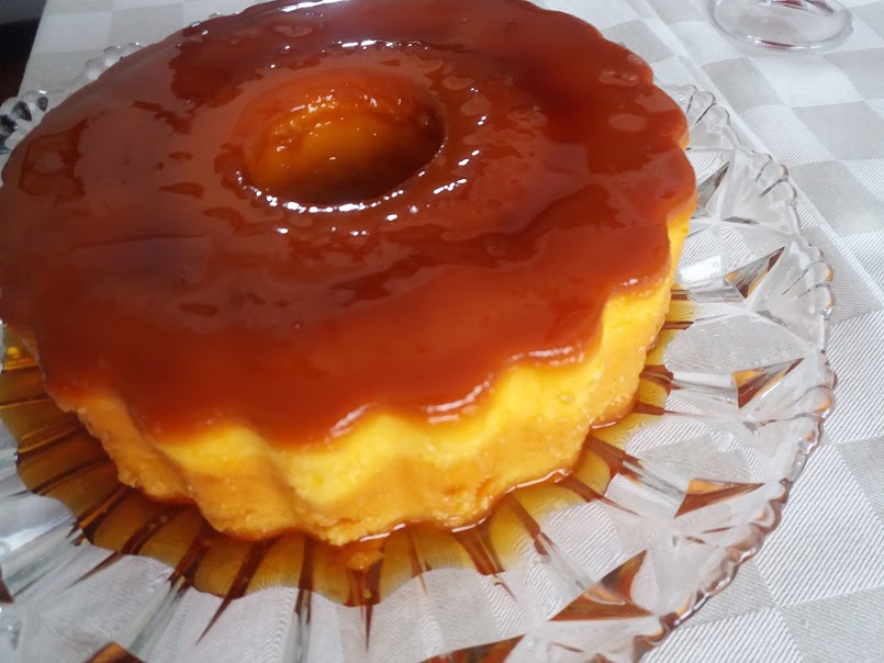 (Na receita original: coloque a forma num tacho e adicione água até meio da forma. Leve ao forno pré-aquecido nos 190º e deixe cozer aproximadamente 1 hora e 15 minutos.Depois do pudim cozido, retire-o e deixe arrefecer um pouco.Quando estiver morno, desenforme.Depois do pudim frio está pronto a servir).