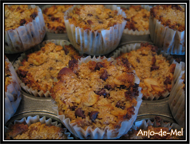 Preparação: Forrar um tabuleiro de muffins com forminhas de papel frisado e reservar. Numa taça, misturar as farinhas peneiradas juntamente com o fermento, o bicarbonato e a mistura de especiarias, acrescentando o farelo que ficou na peneira. Acrescentar o açúcar e os arandos e mexer bem. Noutra taça, colocar os ovos, bater ligeiramente e adicionar o iogurte e o óleo, misturando bem. Fazer um 'poço' na taça dos ingredientes secos e verter para lá a mistura húmida; misturar bem apenas até estar tudo bem incorporado. Colocar colheradas de massa nas forminhas e levar ao forno pré-aquecido a 200ºC durante 15 minutos. Retirar e deixar arrefecer um pouco no tabuleiro, antes de transferir para uma rede até estarem completamente arrefecidos. Depois de frios, guardar numa caixa hermética (ou congelar). Nota: receita adaptada do livro '1001 Cupcakes, Cookies & other Tempting Treats'.